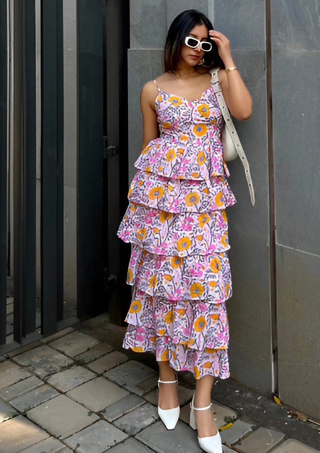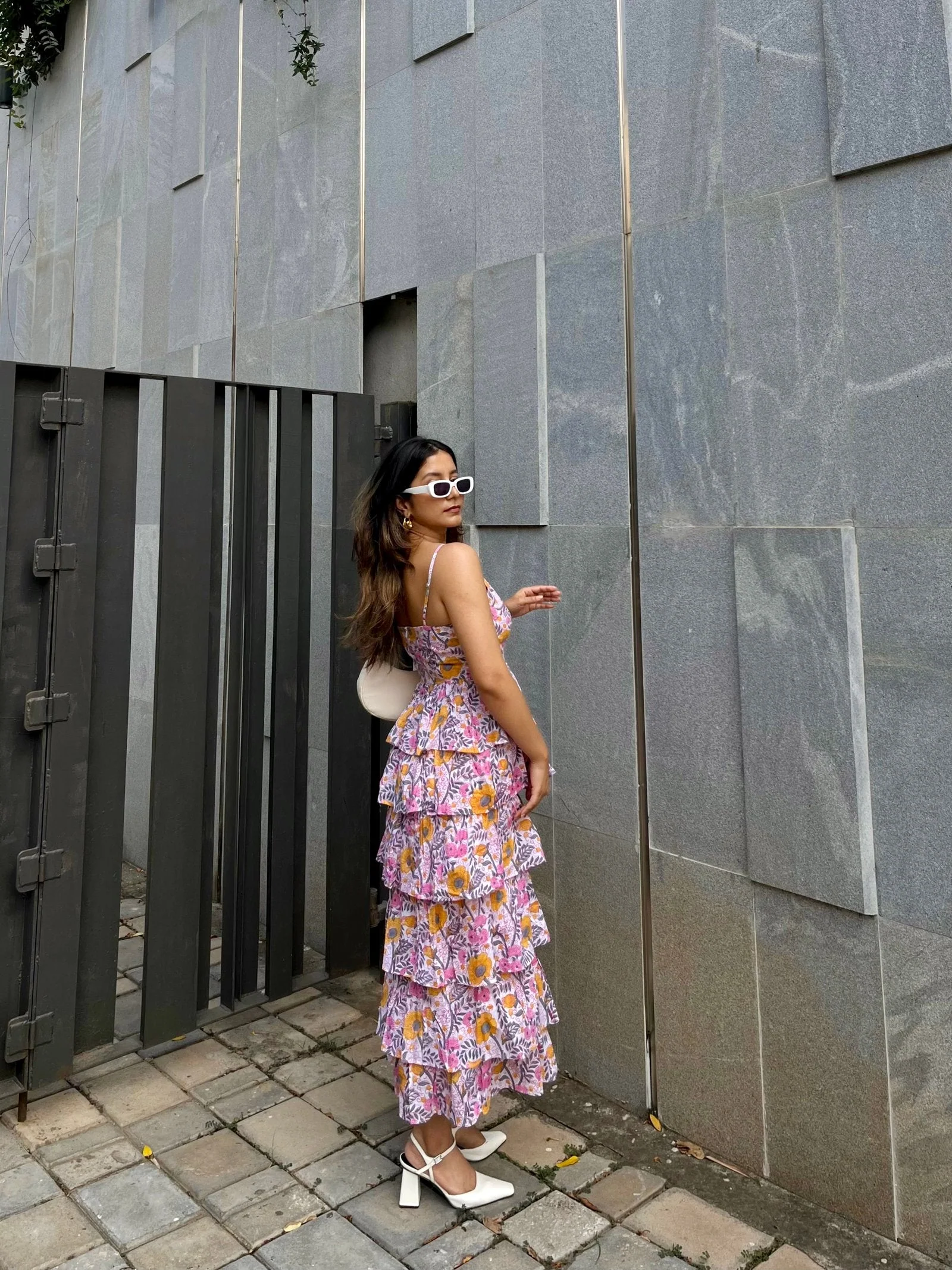 ✨ Silhouette: Multi-tiered ruffle design with spaghetti straps – playful yet chic