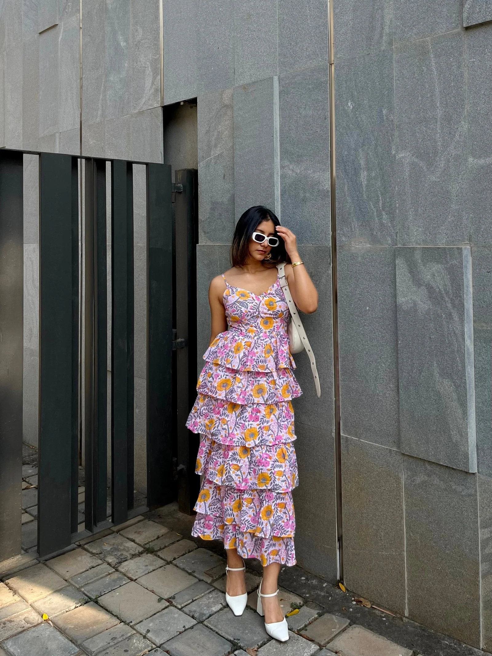 🎨 Print: Handblock floral print in refreshing hues of lilac, yellow & pink